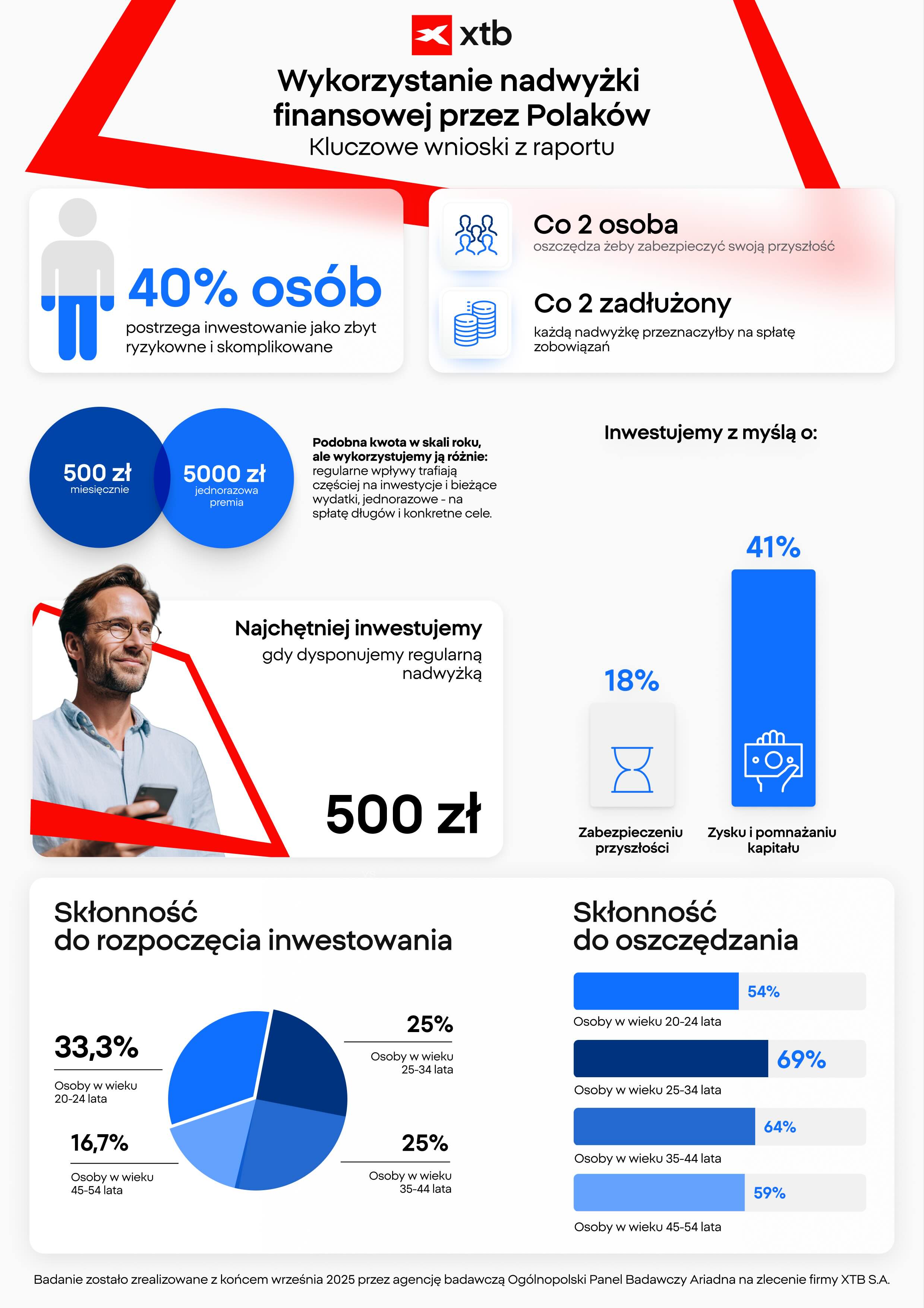 Raport „Wykorzystanie nadwyżki finansowej przez Polaków", przygotowany przez Ogólnopolski Panel Badawczy Ariadna na zlecenie XTB, bazuje na odpowiedziach 1084 osób i analizuje, jak zmieniają się decyzje finansowe Polaków w zależności od tego, czy dodatkowe pieniądze pojawiają się regularnie (500 zł miesięcznie), czy jednorazowo (5000, 50 000 lub 500 000 zł). Wyniki pokazują, że forma otrzymywania pieniędzy ma niemal równie duże znaczenie co ich wysokość.