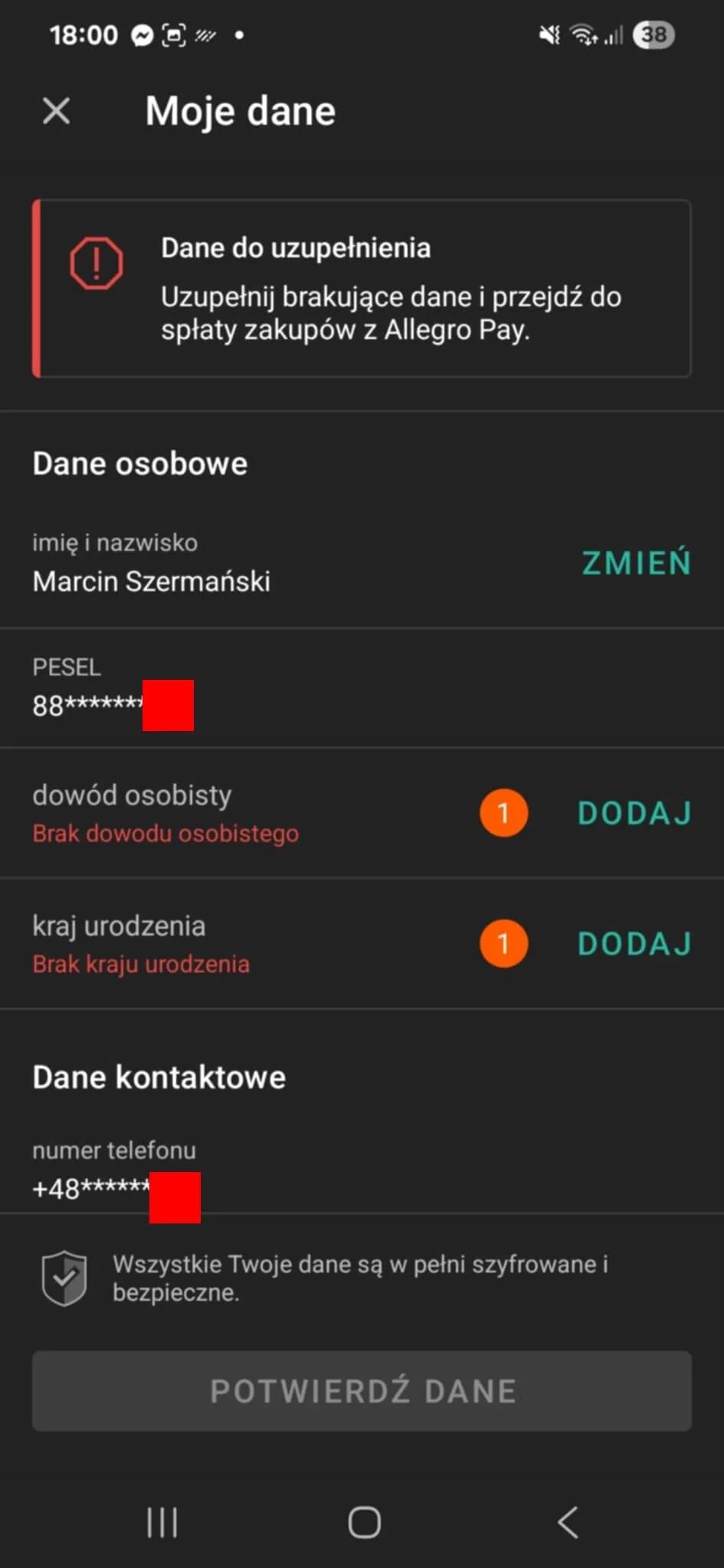 Okazało się, że Allegro - jak nigdy wcześniej - zażądało ode mnie uzupełnienia danych na temat mojego dowodu osobistego (seria i numer dowodu, a także jego termin ważności) oraz kraju urodzenia. Przezornie podchodząc do tej wątpliwie fajnej nowości, nie uzupełniłem brakujących pól, choć aplikacja podkreślała, iż "wszystkie moje dane są w pełni szyfrowane i bezpieczne".
