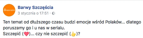 Telenowele, które goszczą na antenie niemal każdej stacji, są świetnym sposobem na edukowanie obywateli. W niczym nieskrępowany sposób dowolne zjawisko społeczne można pokazać, aby w ten sposób oswoić z nim ludzi, a pośrednio tak wpływać na zmianę niektórych przyzwyczajeń. Dlatego właśnie popularne Barwy Szczęścia na TVP2 dają prawo głosu antyszczepionkowcom. Zamiast tego powinni ich zmieszać z błotem.