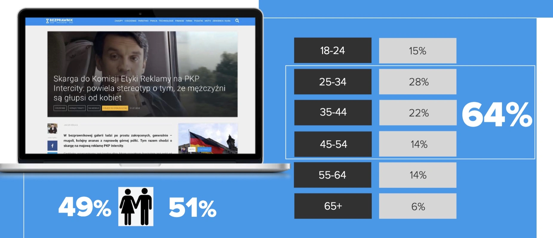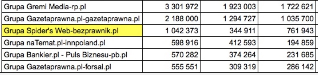 Ponieważ Bezprawnik jest owocem spółki zawartej pomiędzy mną, a Przemysławem Pająkiem, serwis wliczamy do grupy medialnej Spider's Web, do której należą też pozostałe serwisy Przemka: Spider's Web, Spider's Web Rozrywka oraz Autoblog. Już przed miesiącem pomogło nam to w osiągnięciu dużego sukcesu jako grupa i przegonienie Grupy NaTemat, do której prócz najbardziej znanego serwisu Tomasza Lisa, wliczają się m.in. InnPoland i ASZdziennnik. Spory był w tym udział Bezprawnika, który dzięki swojej nieco mniej technologicznej tematyce jest w stanie skutecznie dotrzeć do zupełnie nowej grupy docelowej (z ankiety przeprowadzanej w maju wyszło nam, że 31% czytelników pracuje w branży prawnej, 35% to przedsiębiorcy), odmiennych zainteresowań, większej liczby kobiet oraz osób nieco starszych.