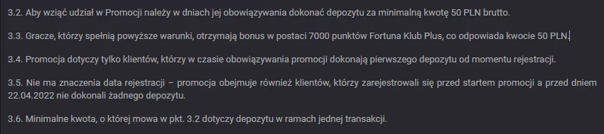 wyciąg z regulaminu bonusu oferowanego przez Fortuna online Zakłady Bukmacherskie Sp. z o.o.