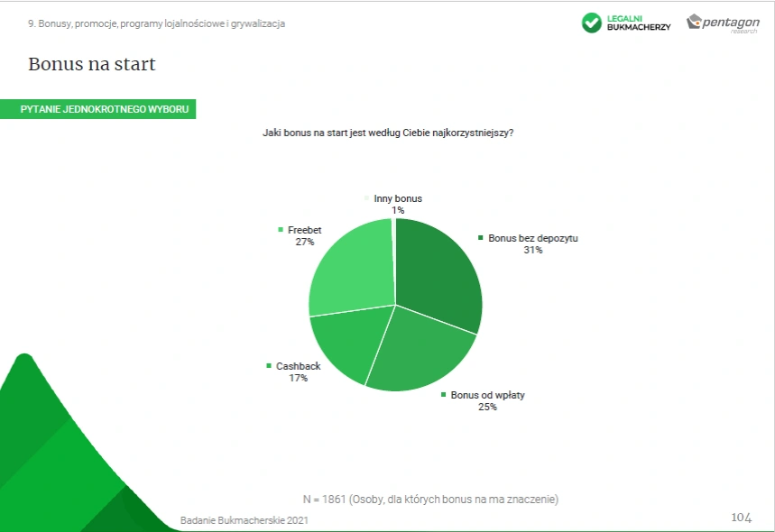 Nie wszystkie bonusy powitalne u bukmacherów cieszą się jednakowym zainteresowaniem. Dane zebrane w ramach Badania Bukmacherskiego 2021 przez Pentagon Research pokazują, że według klientów najkorzystniejszy dla nich jest bonus bez depozytu. Z kolei 27% badanych pozytywnie wypowiada się o freebet, a co czwarty ankietowany najbardziej ceni sobie bonus od wpłaty. Z tyłu pozostały cashbacki z 17% wskazaniem.