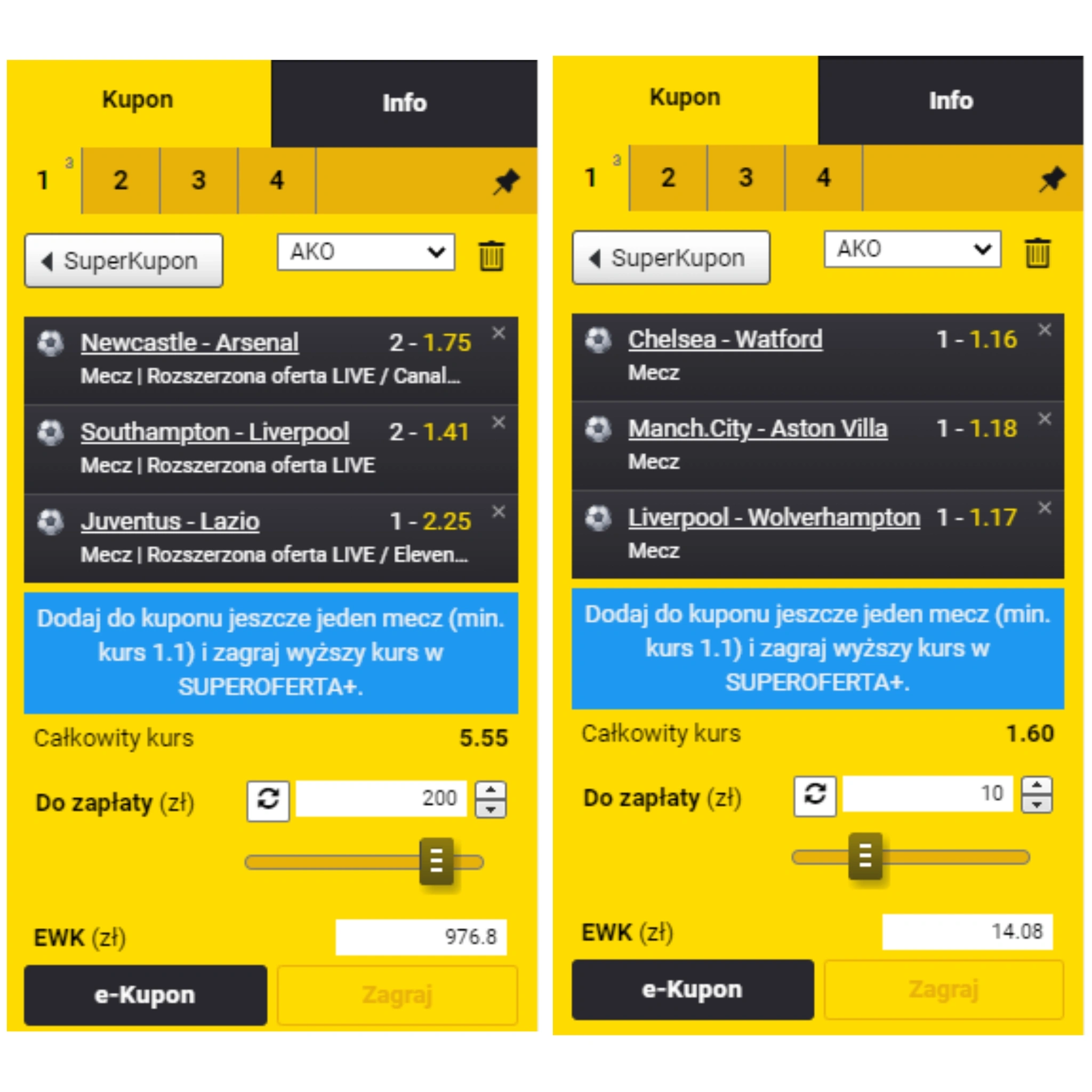 Inaczej będzie w kuponie prezentowanym po prawej stronie. Zrealizowane w nim zostały co prawda kryteria dotyczące ilości zdarzeń na kuponie, jednak kurs każdego spotkania jest zdecydowanie zbyt niski. Wpłacana kwota również jest zbyt mała.