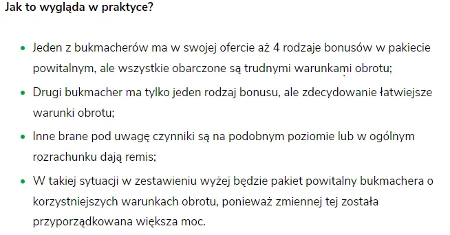 Dlatego też przy wyborze odpowiedniej oferty powitalnej, warto korzystać z dostępnych w internecie zestawień ofert bukmacherskich. Dzięki temu w jednym miejscu można realnie ocenić, u którego bukmachera można na starcie zyskać najwięcej. Niekiedy w pracę nad porównywarką angażuje się ekspertów opracowujących specjalne metodologie. Biorą one pod uwagę wszystkie najważniejsze czynniki zawarte w regulaminach zakładów bukmacherskich.