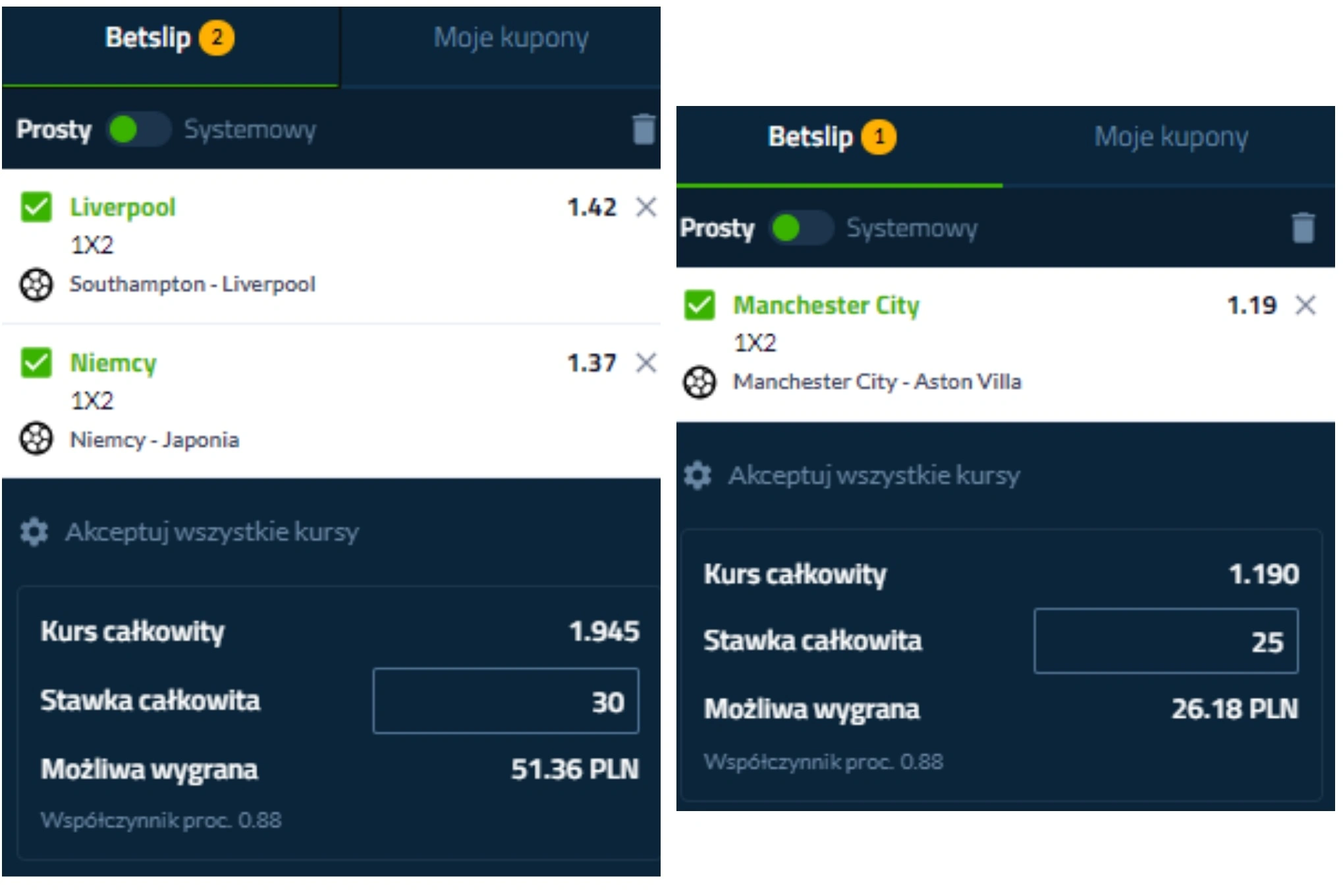 Analogicznie sytuacja będzie wyglądała w przypadku wyboru bonusu typu freebet oferowanego przez forBET. Przykładowo bukmacher daje nam 30 zł bonusu, a jedynymi warunkami jest jednokrotność obrotu i kurs minimalny 1,3. W takim przypadku kupon prezentowany z lewej strony spełnia wszystkie wymogi stawiane przez firmę. Z kolei ten widoczny po prawej stonie nie będzie brany pod uwagę przy końcowym rozliczeniu bonusu.