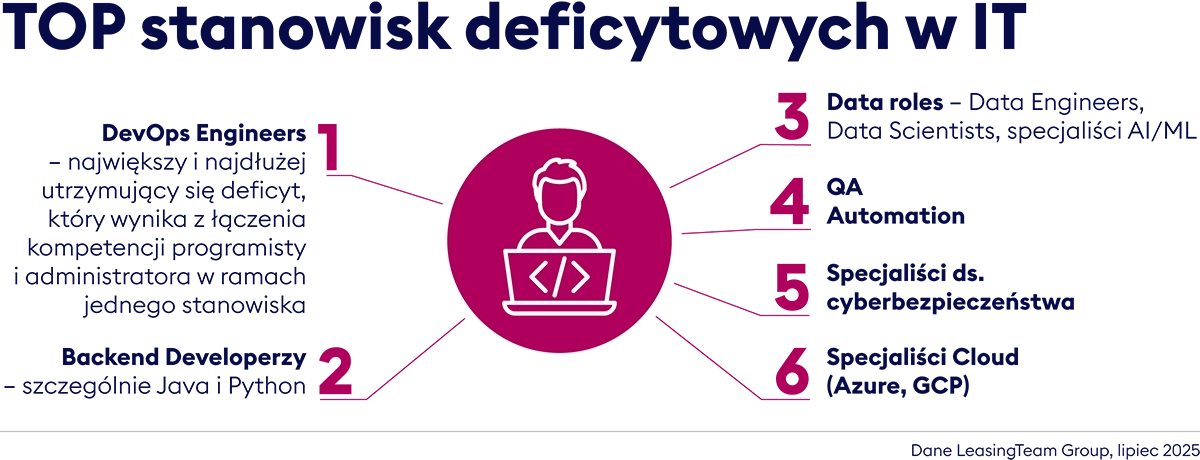 Branża technologiczna przechodzi transformację – udział ofert dla klasycznych programistów (Backend, Frontend, Fullstack) spadł z ponad 50% do ok. 36–37%. Rośnie zapotrzebowanie na role łączące różne kompetencje – DevOps, Cloud, Data Science, AI, CRM. Firmy coraz częściej szukają też specjalistów infrastrukturalnych, Scrum Masterów czy Product Ownerów. Jednocześnie powrót do pracy stacjonarnej w części firm ogranicza dostęp do talentów z mniejszych miast, a wdrożenie juniorów w trybie zdalnym bywa wyzwaniem.