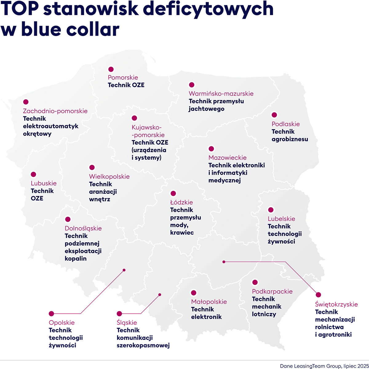 Sytuacja w zawodach fizycznych odzwierciedla gospodarcze realia – tam, gdzie bezrobocie jest niskie, brakuje ludzi. Problem jest szczególnie widoczny w dużych ośrodkach jak Warszawa, Wrocław czy Poznań. Do tego Polska wciąż odstaje od Europy pod względem robotyzacji – w przemyśle mamy jedynie 78 robotów na 10 tys. pracowników (dla porównania Niemcy – 429, Czechy – 207). W efekcie, w branżach takich jak produkcja, logistyka czy przemysł niedobory kadrowe są trwałe. W wielu województwach brakuje techników o konkretnych kwalifikacjach, np. techników OZE, mechaników lotniczych czy elektroników.