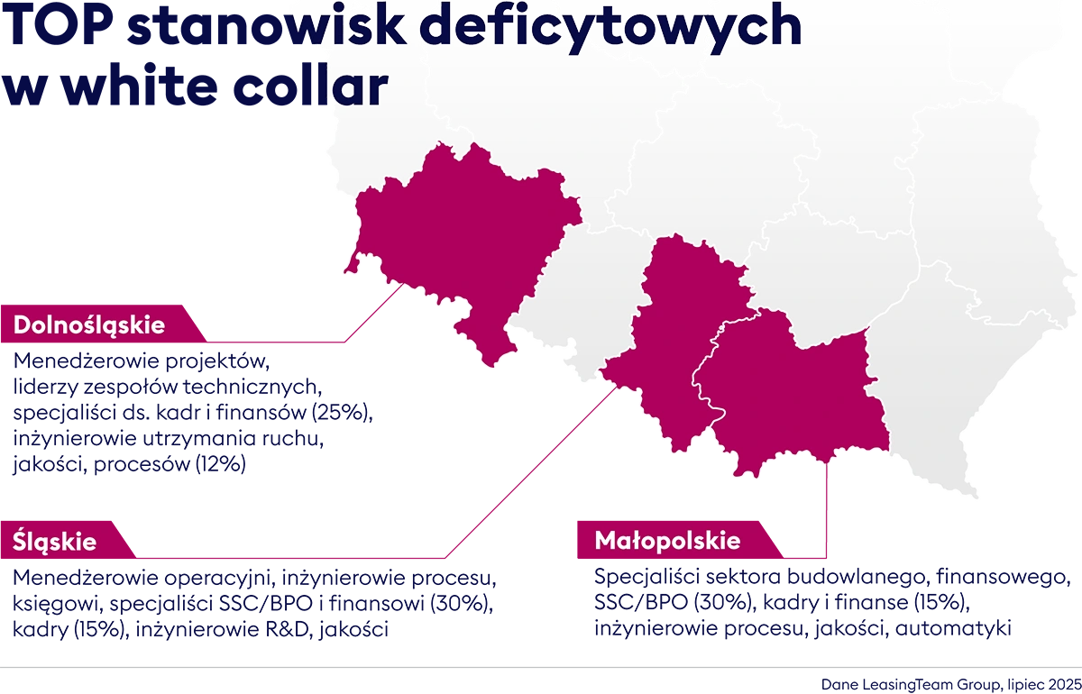 W segmencie pracowników umysłowych największe niedobory odczuwają Mazowsze, Dolny Śląsk i Małopolska – regiony o silnej koncentracji przemysłu i nowoczesnych usług. Tu płace potrafią być znacznie wyższe niż w innych województwach. Przykładowo inżynier procesu we Wrocławiu może liczyć na 10–13 tys. zł brutto, podczas gdy w Rzeszowie czy Kielcach jego odpowiednik zarobi 7–9 tys. zł. Na liście najbardziej deficytowych stanowisk są m.in. menedżerowie projektów, inżynierowie utrzymania ruchu, specjaliści ds. kadr i finansów czy eksperci R&D.