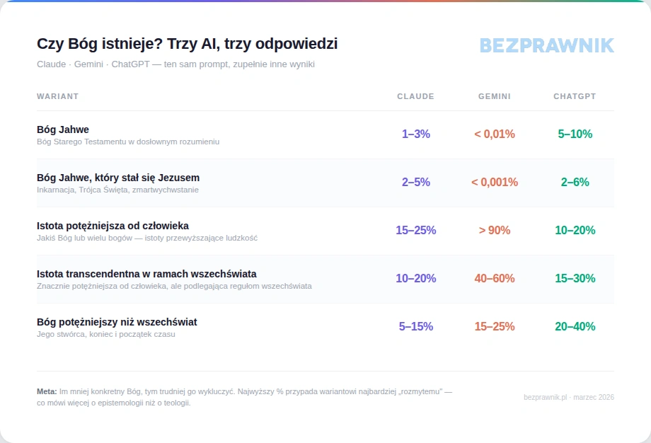 Każdemu z trzech modeli zadałem identyczne pytanie: „Jak sądzisz, jakie są procentowe szanse, że Bóg istnieje?" — w pięciu wariantach, od najbardziej konkretnego (Jahwe rozstępujący Morze Czerwone) do najbardziej abstrakcyjnego (Absolut będący początkiem i końcem czasu). Modele dostały pełną swobodę odpowiedzi.
