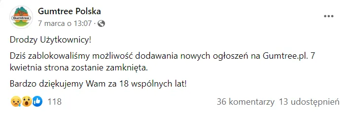 - Spokojnie, nie chodzi o OLX. Ale legenda serwisów ogłoszeniowych znika z polskiej sieci