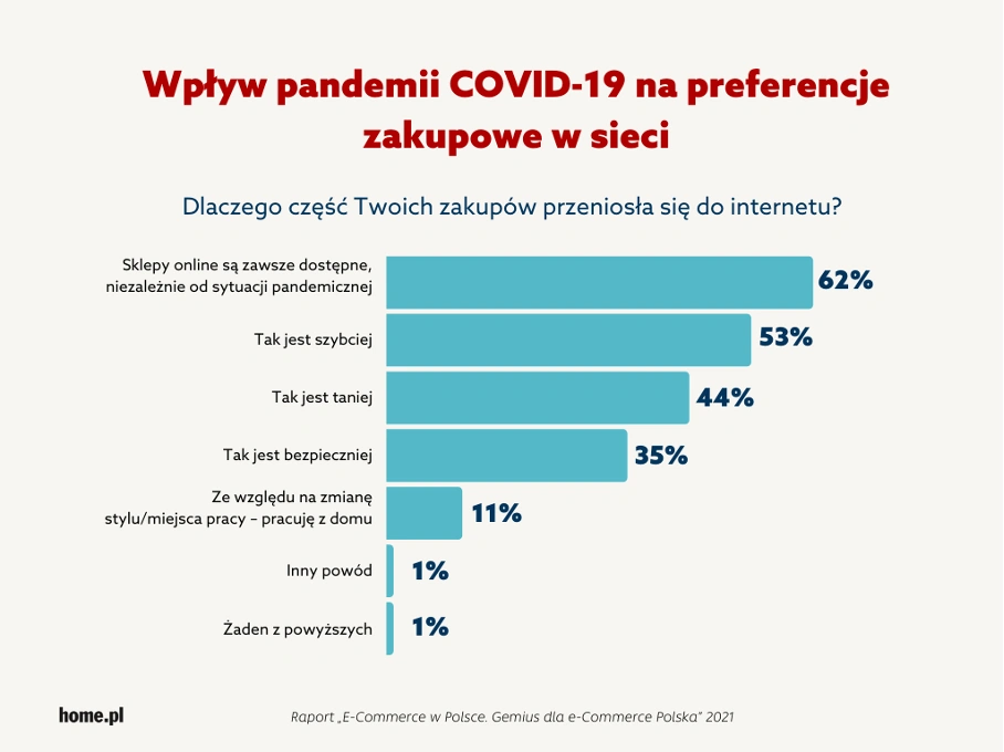 Pandemia zmieniła upodobania zakupowe Polaków oraz mieszkańców całego globu. Pozostańmy jednak na naszym rodzimym podwórku. Według raportu „E-commerce w Polsce. Gemius dla e-Commerce Polska 2021” 77% internautów deklaruje robienie zakupów online, a 75% kupuje w polskich sklepach internetowych. Co więcej, zmiana nawyków zakupowych staje się permanentna – konsumenci deklarują, że po pandemii nadal będą kupować w sieci.