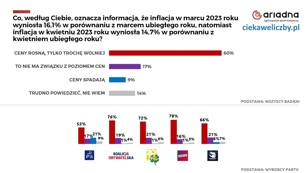 Dodatkowo nie czepiałbym się osób, które udzielają odpowiedzi "To nie ma związku z poziomem cen". Niezależnie do tego, na jaką partię głosują. Definicja inflacji wcale nie musi być przecież najprostsza. To, co nam każdego miesiąca podaje GUS to "wskaźniki cen towarów i usług konsumpcyjnych", obliczany według drobiazgowo skonstruowanej metodologii. Instytucja ta jest przy tym świadoma rozbieżności pomiędzy publikowaną przez siebie statystyką a społeczną percepcją inflacji. W broszurze GUS "Co warto wiedzieć o inflacji?" możemy przeczytać: