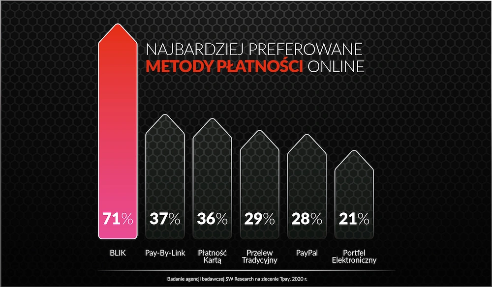 Olbrzymie znaczenie dla rozwoju biznesu online ma udostępnienie popularnych sposobów płatności. Pozwala to zwiększyć poziom satysfakcji i zadowolenia klientów oraz szybko i wygodnie zakończyć zakupy. Tą najbardziej lubianą i preferowaną przez Polaków formą rozliczenia w e-commerce jest BLIK. Według badania SW Research przeprowadzonego na zlecenie Tpay, wybiera go aż 71 proc. ankietowanych. Tym samym BLIK zdecydowanie wyprzedza w rankingu preferencji Polaków szybkie przelewy (37 proc.) oraz karty (36 proc).