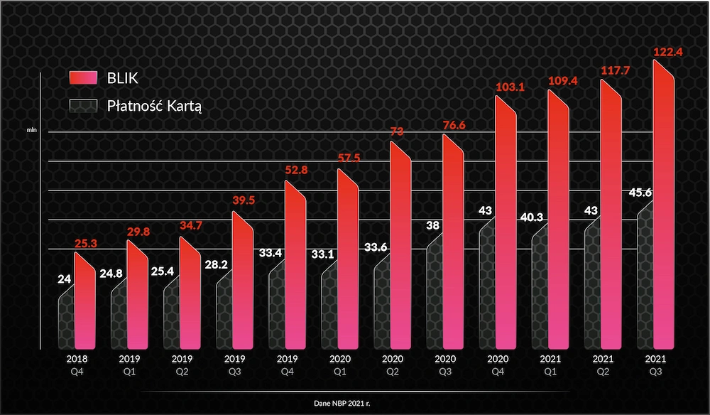 Ponadto, dane dotyczące klientów banku PKO Banku Polskiego pokazują, że tylko podczas zeszłorocznego Black Week, czyli jednego z największych świąt zakupowych w roku, prawie 63 proc. wszystkich transakcji online zostało zrobionych przez nich BLIKIEM. Zdystansował on tym samym pozostałe sposoby płatności. Szybkim przelewem (Pay by link) zapłaciło wówczas 26 proc. konsumentów, a kartę wybrało zaledwie ok. 13 proc. e-kupujących.