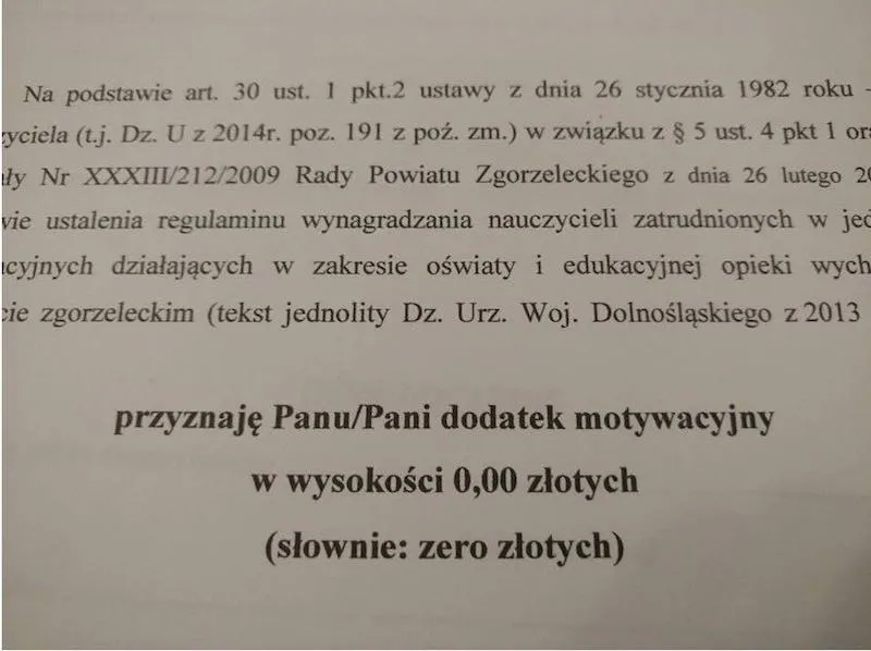 „Przyznaję Panu/Pani dodatek motywacyjny w wysokości 0,00 zł (słownie: zero złotych)” - to nie żart, to pismo skierowane do nauczyciela pracującego w jednej ze szkół w powiacie zgorzeleckim.
