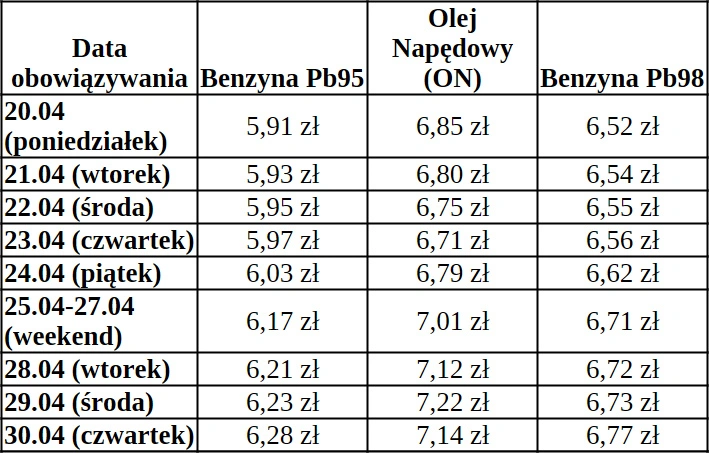 O tyle wzrosły ceny paliw w Polsce za litr w dniach 20-30 kwietnia 2026: