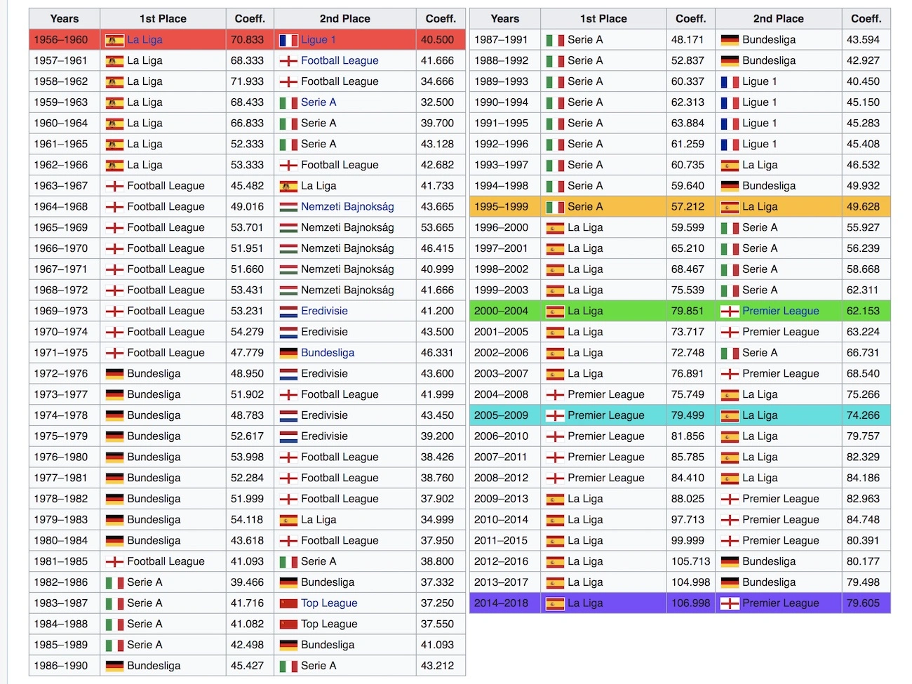 Swoją drogą, na Wikipedii można znaleźć tabelę, która dość sensowny pomysł Współczynnika UEFA stosuje nawet do lat ubiegłych, przed jego faktycznym obowiązywaniem, co historycznie stanowi ciekawą mapę dominacji danej ligi.
