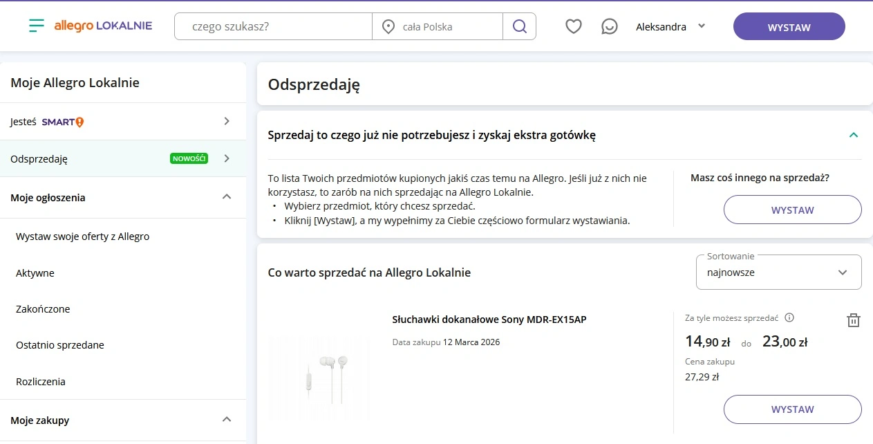 Dane o nabytych produktach migrują się między obiema wersjami platformy automatycznie. Żeby móc skorzystać z funkcji „Odsprzedaję", nie musimy robić niczego szczególnego. Wystarczy, że mamy konto na głównym Allegro i przez zakładkę „Sprzedaż" przejdziemy na Allegro Lokalnie.