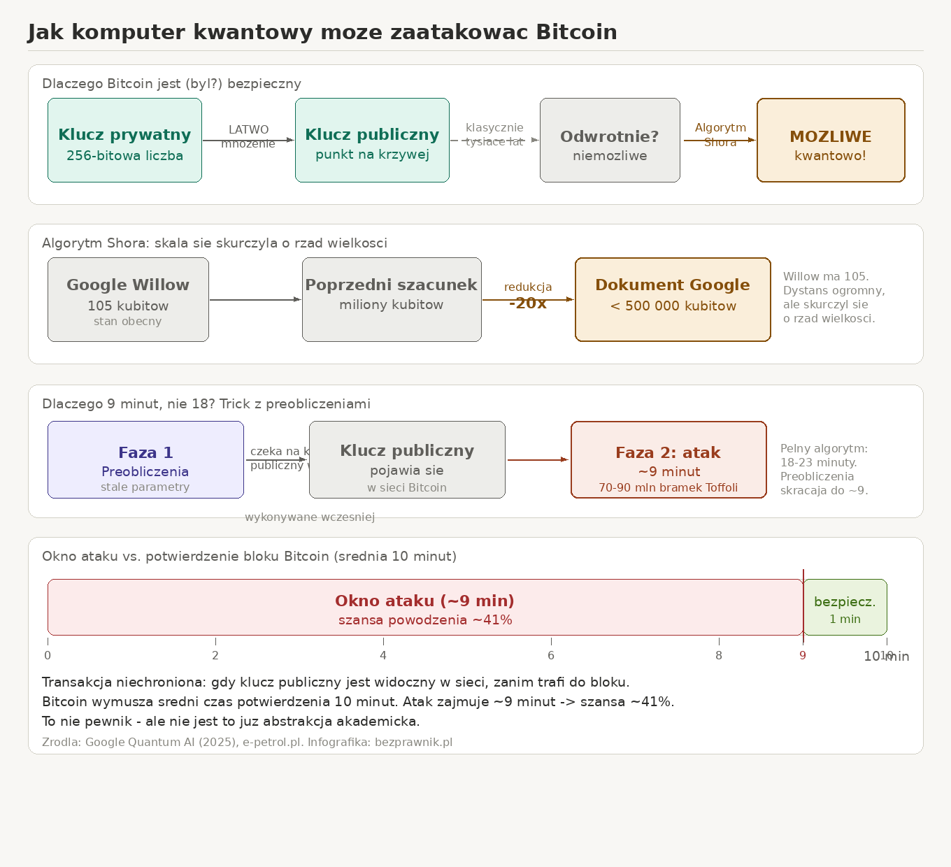 Uzasadnienie brzmi rozsądnie ujawnienie problemu w sposób odpowiedzialny nie dając potencjalnie zagrażającym osobom gotowego schematu. Ale jest w tym pewna logiczna osobliwość. Google twierdzi równocześnie, że żaden działający komputer kwantowy zdolny do przeprowadzenia takiego ataku nie istnieje i że szczegóły są zbyt niebezpieczne, by je ujawnić. Jeśli zagrożenie jest czysto przyszłościowe, dlaczego metodologia ma być tajna?