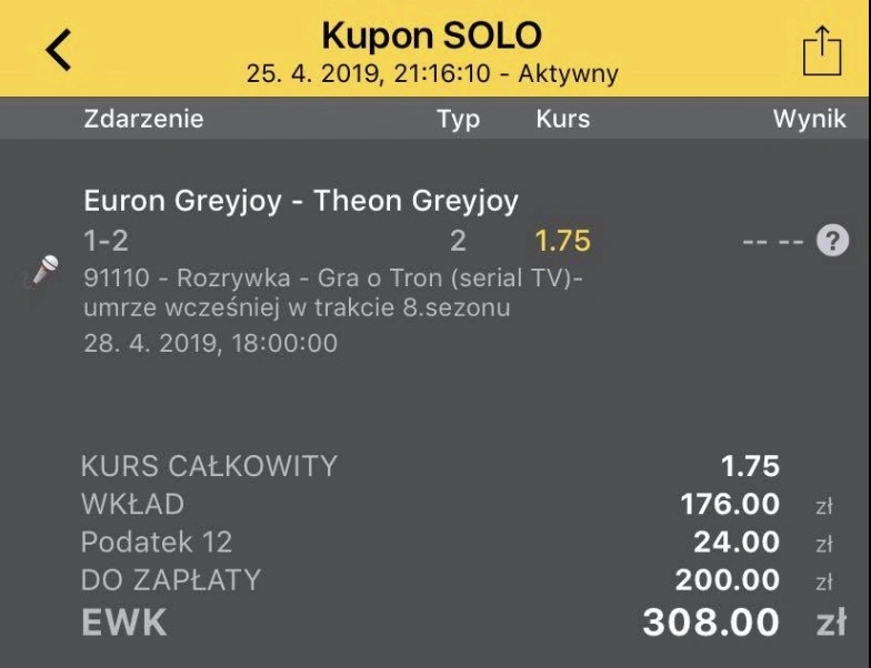 - Można już wytypować u bukmachera, kto zginie następny w Grze o Tron. Ciekawy kurs w rywalizacji Euron vs Theon