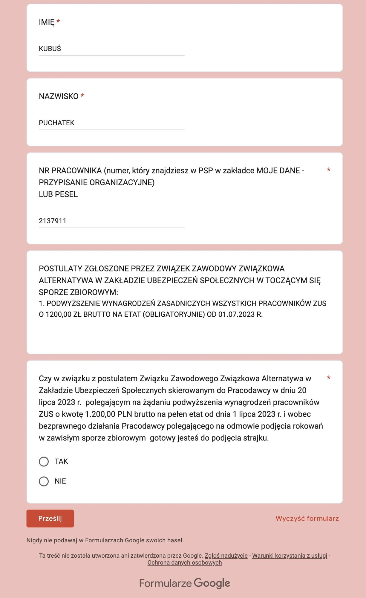 Kolega zajmujący się danymi osobowymi robił ostatnio bazę alergenów dla żłobka i wyglądało to na praktycznie każdej płaszczyźnie bardziej poważnie. Pomijam już nawet "W związku elektronicznym sposobem głosowania w referendum strajkowym dane wskazane w referendum będą dostępne przedsiębiorstwu GOOGLE LLC.", ale druzgocący jest fakt, że związek zawodowy chce prowadzić strajk w oparciu o formularz, który lata po pewnie już Sadisticu, JoeMonsterze i Wykopie. Można do niego wpisać, że Kubuś Puchatek podając swój PESEL lub dowolny z miliona PESEL-i znalezionych w internecie i prawdopodobnie zostanie to zakwalifikowane jako wiążący głos, opowiadający się za organizacją strajku.