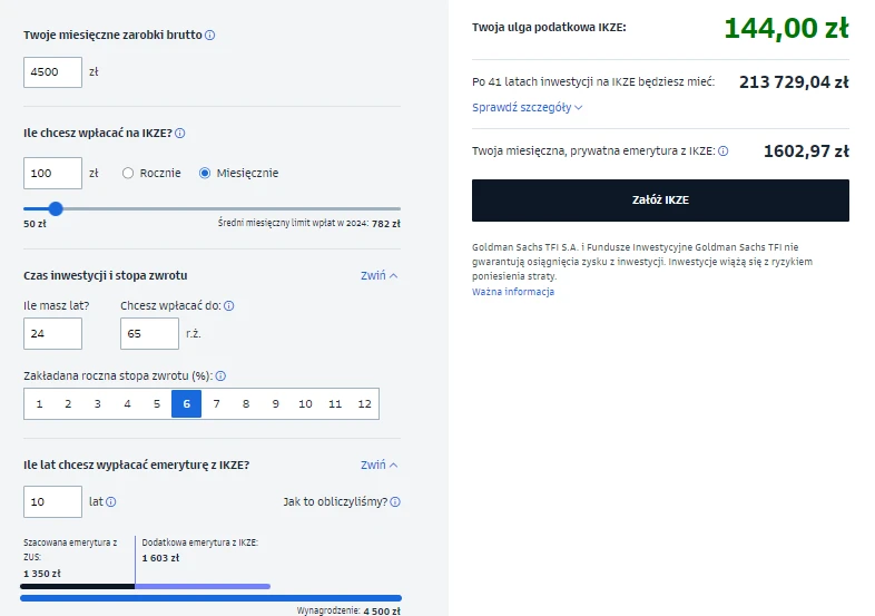 Ile konkretnie można zyskać? To zależy od wielu czynników, ale całość najlepiej zobrazują przykłady obliczone dzięki kalkulatorowi ulgi podatkowej i emerytury z IKZE Goldman Sachs TFI. W pierwszym z nich przyjmijmy, że wchodzący na rynek pracownik po studiach Adam otrzymuje na start pensję 4.500 złotych brutto, a więc niewiele więcej niż obecna pensja minimalna (4.242 złotych). Myśląc już na tym etapie o swojej przyszłości jest on gotowy odkładać 100 złotych miesięcznie w celu wypracowania dodatkowej emerytury. Dzięki długoletnim wpłatom 24-latek uzbiera kapitał w wysokości 213.729,04 złotych, co przełoży się na 1.602,97 złotych miesięcznych wypłat przez 10 lat. Co więcej, już w tym roku Adam będzie uprawniony do ulgi w wysokości 144 złotych.
