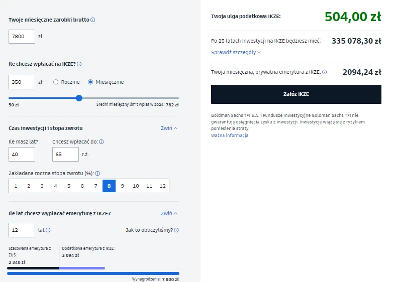 W kolejnym przykładzie do IKZE decyduje się przystąpić 40-letnia Ewa zarabiająca mniej więcej średnie wynagrodzenie otrzymywane w Polsce, a więc ok. 7.800 złotych brutto. Licząc na korzystniejszą stopę zwrotu decyduje się ona na większe ryzyko inwestycyjne, a ze swoich dochodów chce przeznaczać 350 złotych miesięcznie. W ten sposób przez 25 lat Ewa zgromadzi 335.078,30 złotych, co pozwoli jej na dodatkową emeryturę w wysokości 2.094,24 złotych przez 12 lat! W zeznaniu za 2024 rok kobieta będzie też mogła skorzystać z ulgi w wysokości 504 złotych.