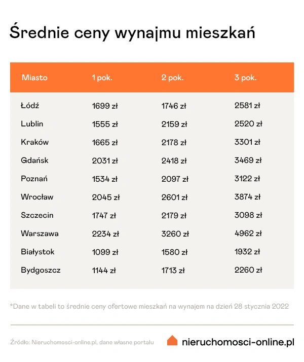 Z kolei dwupokojowe mieszkanie, jak pokazują dane zebrane przez Nieruchomości-online.pl wynajmiemy najtaniej również w Białymstoku (1580 zł), w Bydgoszczy (1713 zł) i w Łodzi (1746 zł). Trzy pierwsze miejsca, w kategorii najdroższych, należą do Warszawy (3260 zł), Wrocławia (2600 zł) i Gdańska (2418 zł). W Białymstoku i Bydgoszczy najtaniej można wynająć również mieszkanie trzypokojowe. Kosztuje to odpowiednio 1932 zł i 2260 zł. Trzecią lokatę zajął Lublin (2520 zł). Aż 4962 zł kosztuje wynajęcie trzech pokoi w Warszawie. We Wrocławiu 3872 zł, a w Gdańsku 3464 zł.