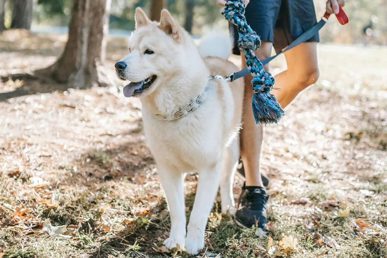 Właściciel z psem na smyczy ma średnio po 3 nogi