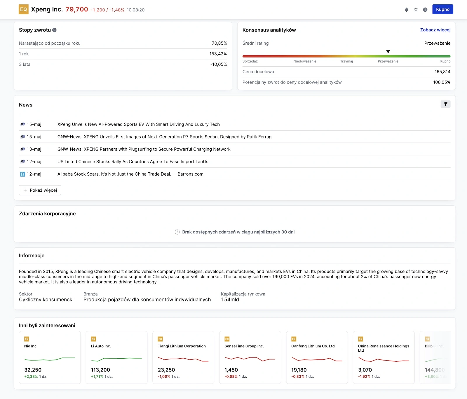XPeng mocno przyśpiesza ekspansję zagraniczną. Spółka podkreśla, że chce dostosować się do rynków lokalnych – np. inwestować w centra R&D za granicą, budować tam serwis i infrastrukturę, a nie tylko importować samochody. XPeng nie sprzedaje aut w USA (unikając w ten sposób amerykańskich ceł i napięć), za priorytet uznaje Europę. Już w 2024 r. formalnie weszła m.in. do Polski. Pozycja rynkowa: XPeng w Chinach to wicelider wśród niezależnych producentów elektryków obok NIO i Li Auto, choć pod względem wielkości ustępuje gigantom jak BYD. Firma wyróżnia się silną ofertą technologiczną – np. jako jedna z pierwszych wdrożyła LIDAR w swoich autach dla lepszego rozpznawania otoczenia. Jej modele zdobywają dobre opinie za jakość wykonania i nowinki (np. P7 miał specjalny tryb „osa” umożliwiający zdalne przemieszczanie samochodu w korku, G9 chwalony za najszybsze ładowanie 800V). Partnerstwo z VW uwiarygadnia XPenga i może oznaczać dodatkowe przychody (licencjonowanie technologii). Na razie spółka działa jednak ze stratą operacyjną, choć dysponuje solidnym zapleczem gotówkowym (m.in. dzięki inwestycji VW), co może wpływać na relatywnie niestabilny kurs notowań.