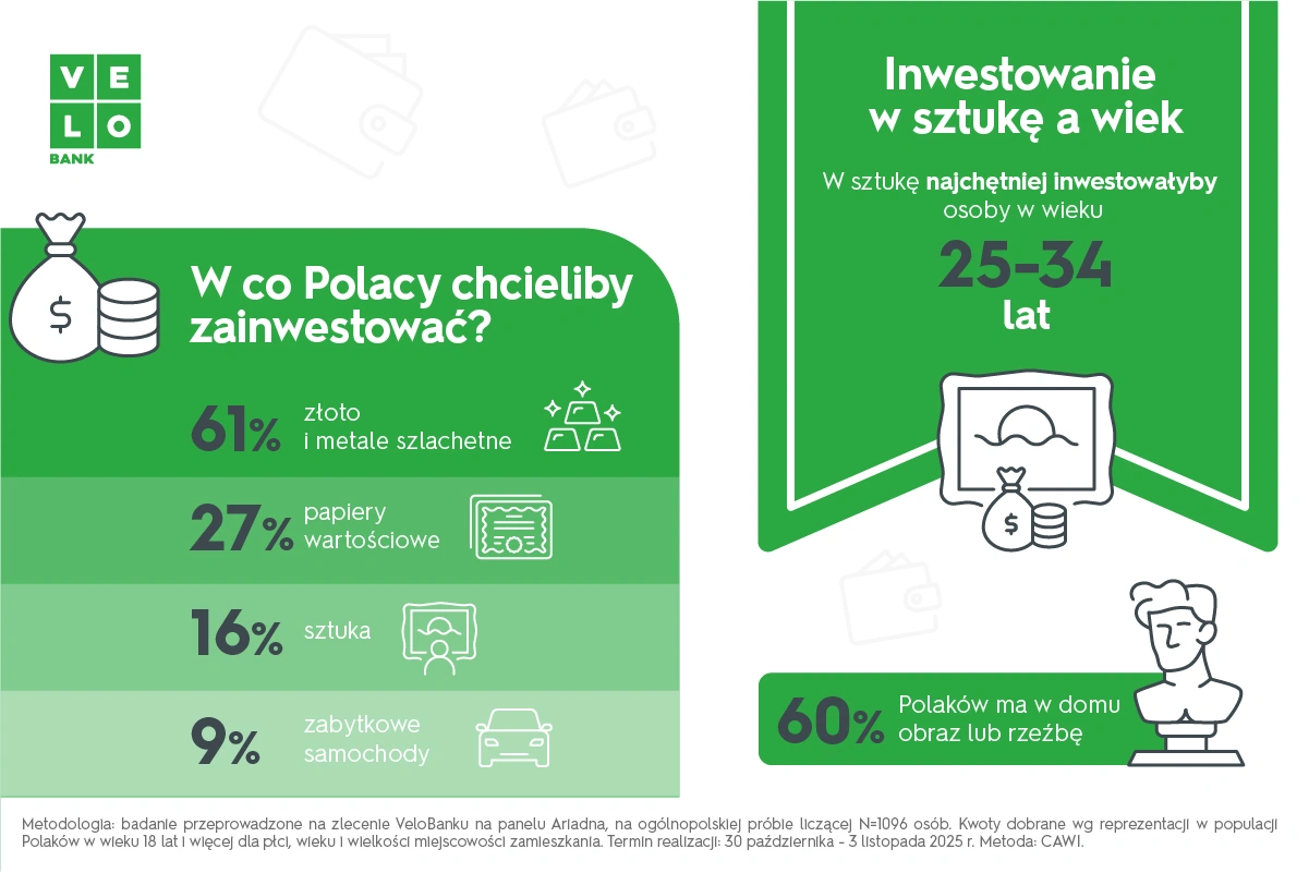 Z badania zrealizowanego na zlecenie VeloBanku na panelu Ariadna (N=1096, CAWI, październik–listopad 2025) wynika, że 60 proc. dorosłych Polaków posiada w domu obraz lub rzeźbę. Jednocześnie zaledwie 16 proc. ankietowanych zadeklarowało, że zainwestowałoby większą sumę pieniędzy w sztukę. Dzieła artystów pełnią w naszym życiu różne funkcje – od elementu wystroju wnętrz, przez pomysł na prezent, aż po potencjalną formę lokowania kapitału. Tyle że ta ostatnia funkcja wciąż pozostaje na dalszym planie.