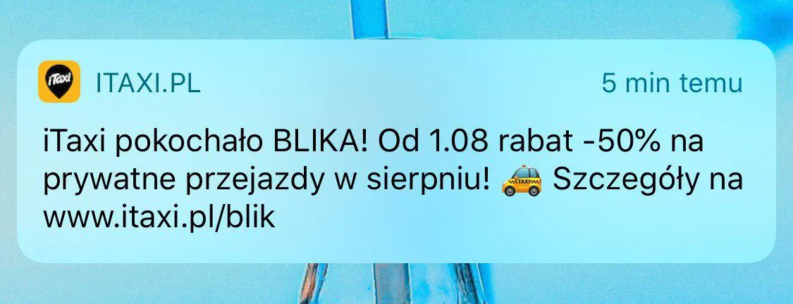 Zainstalowana - ku mojemu zaskoczeniu - w moim smartfonie aplikacja iTaxi przysłała mi właśnie niezwykle intrygujący komunikat. Jeżeli za przejazd zapłacimy BLIK-iem, będzie on kosztował o 50% mniej.
