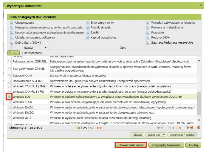 Żeby złożyć wniosek o dodatek solidarnościowy, musimy zalogować się do swojego konta na platformie PUE ZUS. Jeśli wcześniej z niej korzystaliśmy, wnioskując na przykład o pożyczkę dla mikroprzedsiębiorców, nie powinniśmy mieć z tym żadnego problemu. Po zalogowaniu się musimy przejść do zakładki: „Ubezpieczony”. Następnie w bocznym menu znajdujemy pozycję [Dokumenty i Wiadomości – Dokumenty robocze] i ją zaznaczamy. Kolejny ruch to kliknięcie przycisku [Utwórz nowy]. Wyświetli nam się lista dostępnych dokumentów. Znajdujemy pozycję „Wniosek EDS – Wniosek o dodatek solidarnościowy w związku z przeciwdziałaniem skutkom wywołanym COVID-19”, zaznaczamy i klikamy poniżej w przycisk [Utwórz dokument].