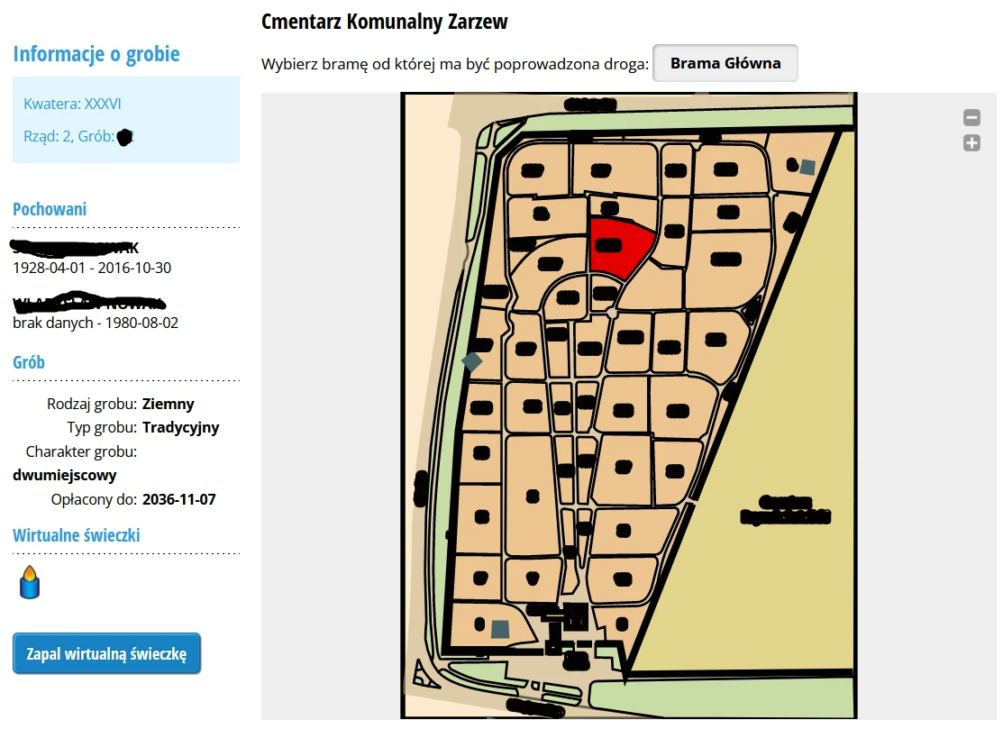 Po kliknięciu opcji „Wyszukaj” pokaże się nam lista znalezionych osób. Zwykle będzie to kilka nazwisk wraz z datami narodzin i zgonu, ale jeśli wiemy choć mniej więcej w jakim okresie żył poszukiwany przez nas zmarły, to powinniśmy natrafić na poszukiwany grób. Klikając obok nazwiska wybranej osoby strona przenosi nas do mapy cmentarza, na którym pochowana jest dana osoba. Sektor, w którym znajduje się grób świeci się na czerwono. Dostajemy też informację o tym w jakim rzędzie znajduje się miejsce pochówku. W ten sposób znacznie łatwiej będzie nam się dostać do celu.