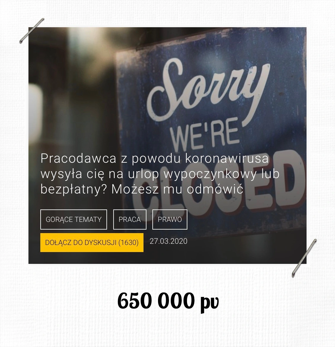 Choć na ten wynik składa się praca kilku tysięcy tekstów opublikowanych na przestrzeni 5 lat, mieliśmy kilka "lokomotyw", które niosły się po sieci w najbardziej energiczny sposób. Śmiało można założyć, że poniższe teksty same zapracowały na przynajmniej 20% naszego miesięcznego wyniku, co oczywiście bardzo nam imponuje. Tekst Pawła o przymusowym urlopie wypoczynkowym lub bezpłatnym z racji koronawirusa przeczytało więcej osób, niż całego Bezprawnika w 2015 roku. Niesamowite.