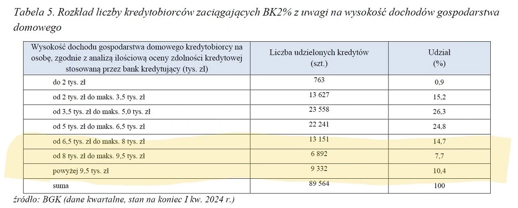 Ta konkretna kwota nie wzięła się znikąd. W ocenach skutków regulacji jednej z wersji ustawy o Kredycie na start znajduje się całkiem interesująca tabela nr 5. Zawiera ona rozkład liczby kredytobiorców zaciągających Bezpiecznego Kredytu 2 proc. z uwagi na wysokość dochodów gospodarstwa domowego. Przygotowano ją w oparciu o dane Banku Gospodarstwa Krajowego.