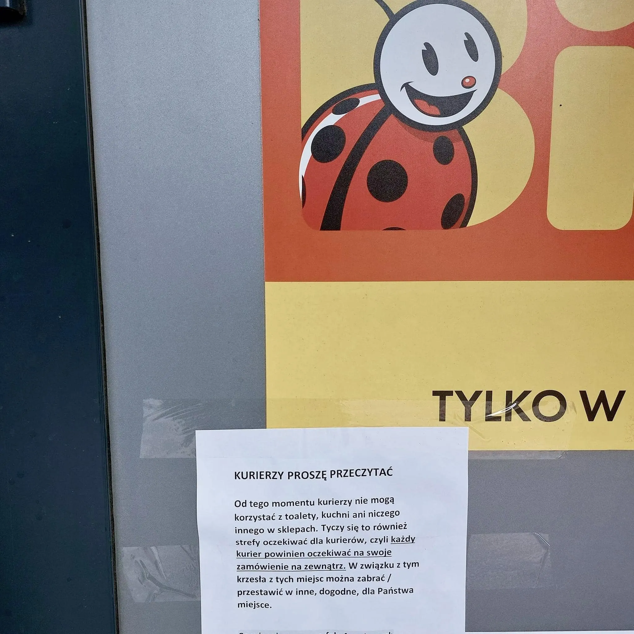 Internet obiegła wywieszona w jednym ze sklepów dyskontowej sieci kartka, która... no cóż, jest po prostu szalenie smutna. Wynika z niej, że kurierzy Glovo są niemile widziani w Biedronce. Na tyle, że nie mogą w niej korzystać ani z toalety, ani z kuchni. Ba, w ogóle nie powinni przekraczać progu sklepu. I na towar grzecznie czekać na zewnątrz.