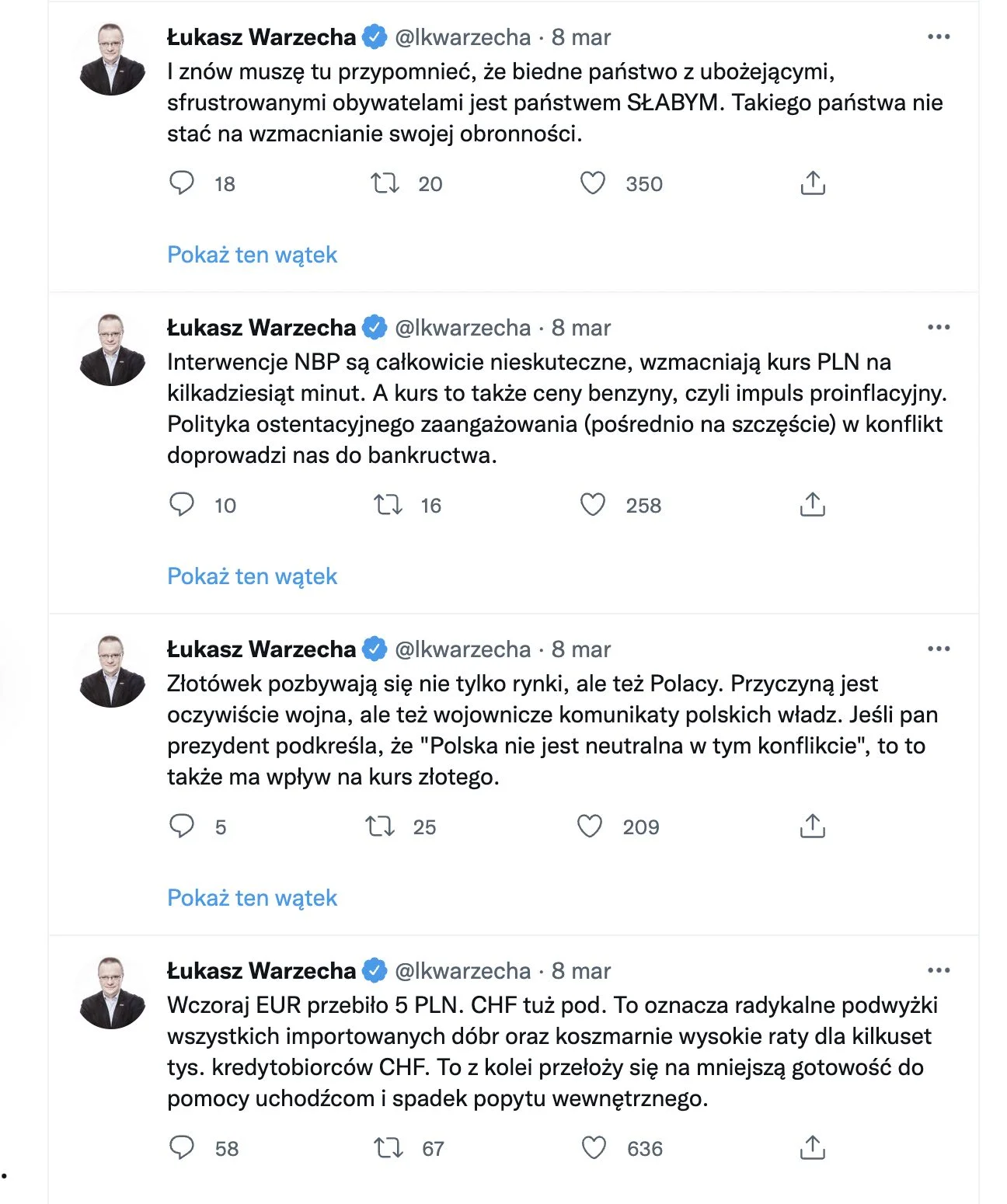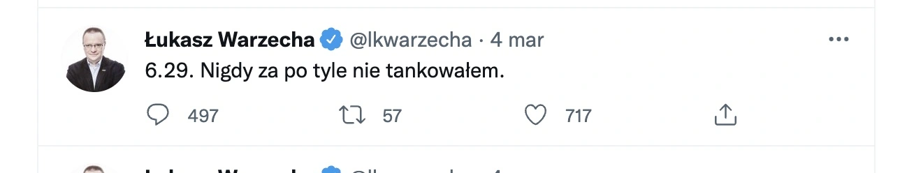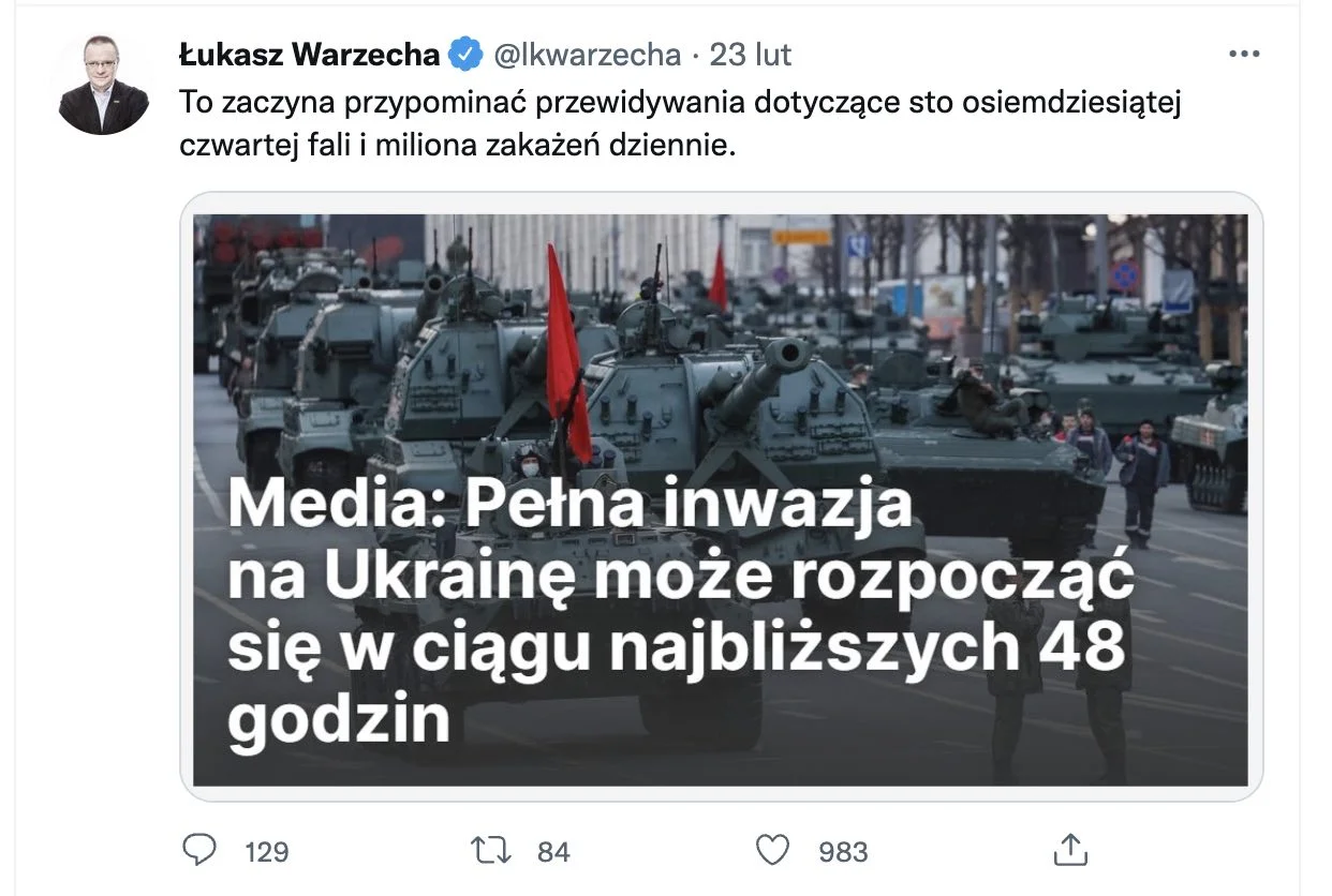 Podobny pomysł na narodową terapię, próbę wyrwania nas choć na chwilę z tego koszmaru, który niektórzy z nas widzą nawet bezpośrednio z okien swych domów, przyjął dziennikarz Łukasz Warzecha. Jego konto w mediach społecznościowych momentami wygląda tak, jak gdyby żadnej wojny tuż przy granicy nie było, a niesforny 47-latek zmaga się z trudami codziennej egzystencji, opisując swoje przemyślenia. To oczywiście sprytna kreacja ku pokrzepieniu serc.