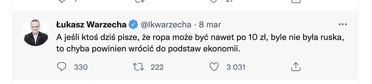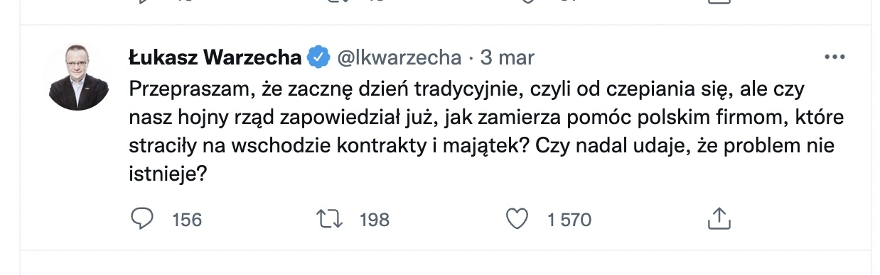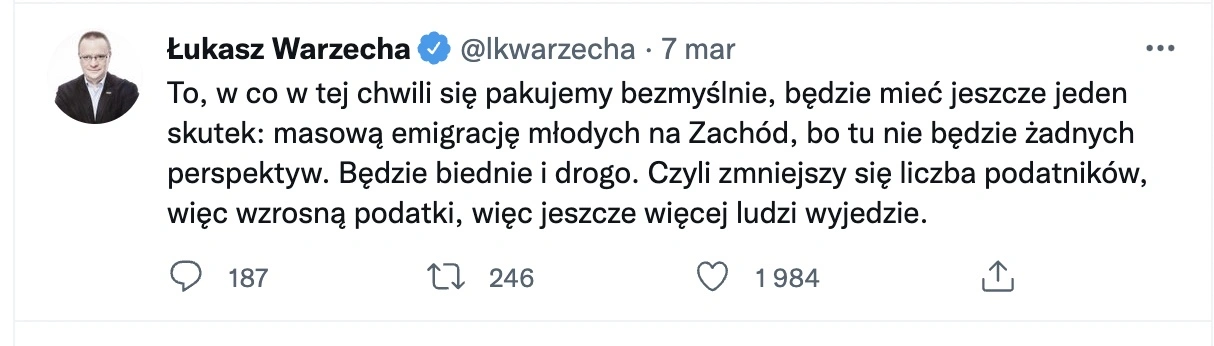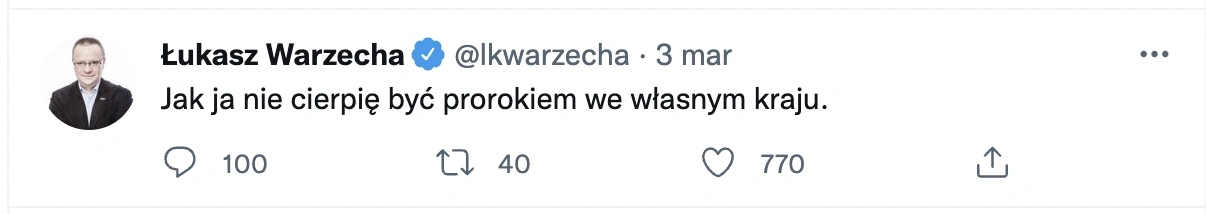 Ktoś mógłbym powiedzieć, że Warzecha ze swoim momentami ciętym poczuciem humoru jest odrealniony. Ja mówię - marzyciel. Czy nie wszyscy chcielibyśmy wyrwać się teraz z otaczającej nas rzeczywistości? Każdy jednak pomaga jak może. Jedni przelewają pieniądze, inni oddają domy, inni świadczą pomoc prawną, inni przebierają się za dinozaura, jeszcze inni organizują transporty, kupują Kinder Niespodzianki, a Łukasz Warzecha dba na Twitterze o nasze morale, przerysowując obecne problemy, sprowadzając ludzkie tragedie do rangi nieistotnych pierdółek, nie bojąc się nawet ośmieszenia własnej osoby dla poprawy humoru ogółu.