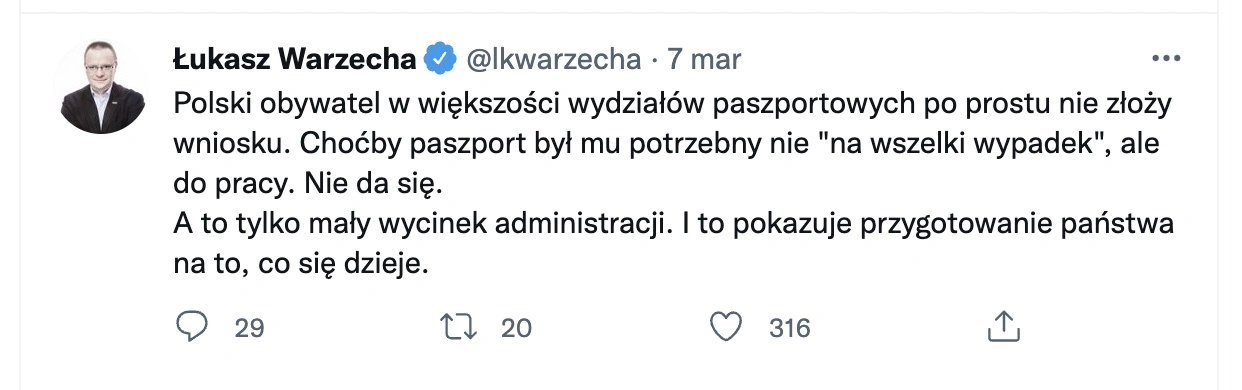 Kiedy uchodźcy z Ukrainy po trzech dobach bez snu z dorobkiem życia upchniętym do reklamówki z ukraińskiej Biedronki stoją na granicy między naszymi krajami, w tym samym czasie Łukasz Warzecha w charakterystyczny dla siebie sposób penetruje przywary polskiej biurokracji i wydłużony czas oczekiwania na nowe paszporty.