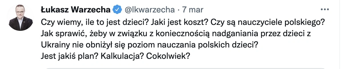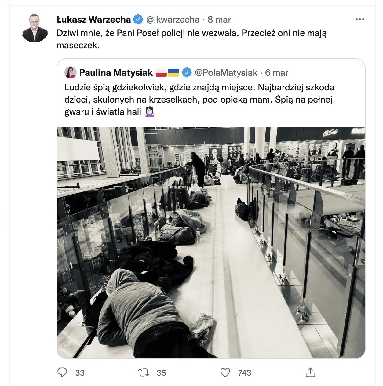 Kiedy posłanka wskazuje w jak tragicznej sytuacji znajdują się obecnie ludzie uciekający przed wojną, Warzecha stara się spłycić rozmiar ich tragedii do tymczasowego dyskomfortu porównywalnego z noszeniem maseczki przez 5 minut w sklepie przez zdrowego, 47-letniego chłopa. Wierzy, że Ukraińcy są silni i podołają wyzwaniu, a potem czekać na nich będzie nagroda.