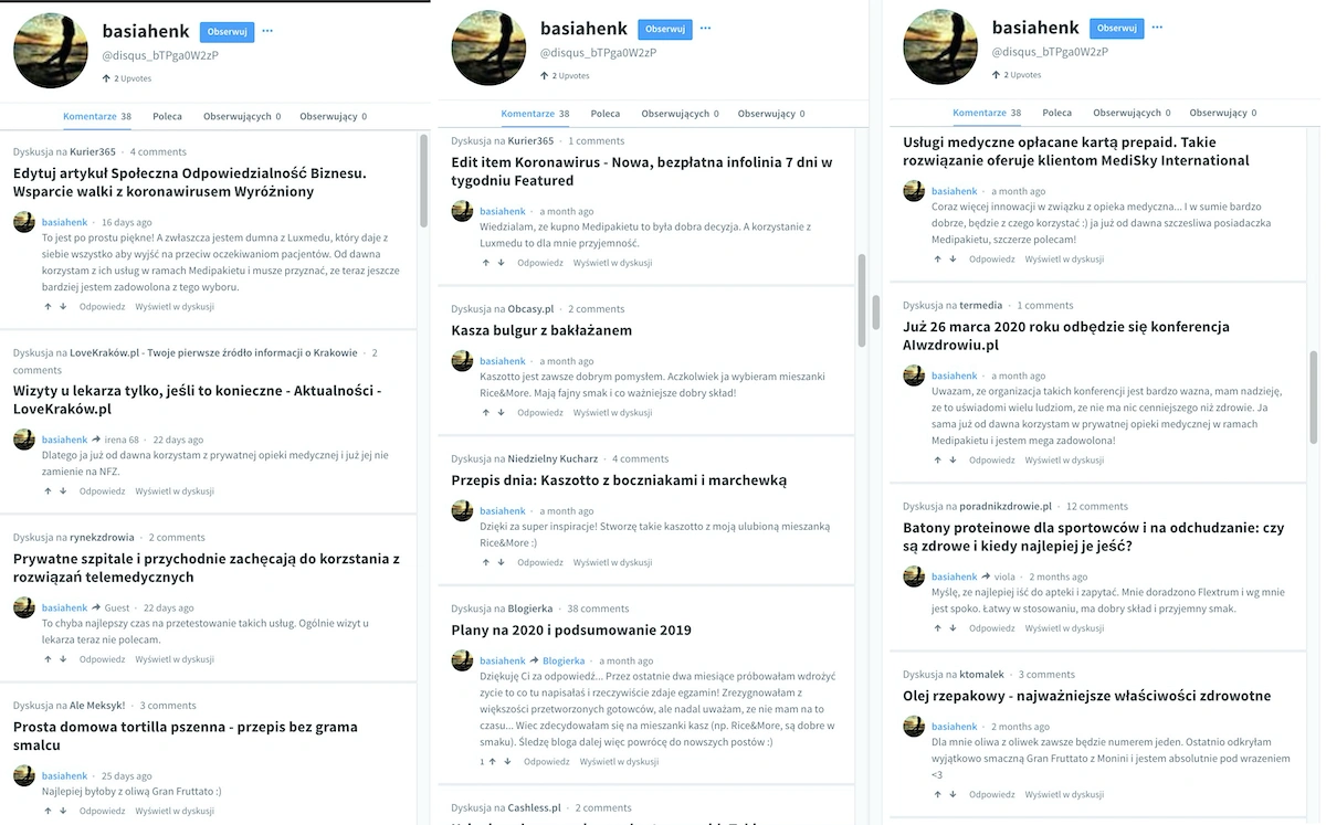 Moim zdaniem to jest trolling, ale z drugiej strony... Nie takie rzeczy już widziałem, nie takie rozmowy odbywałem w cztery oczy, no i faktycznie... Medicover jest jednym ze słów filtrowanych przez nasz system komentarzy. Pozwólcie, że pokażę wam jak to wygląda z perspektywy profilu administratora. Spamerzy przez lata zrobili się coraz sprytniejsi i ukrywają historię swoich komentarzy, jednak nadal mamy możliwość monitorowania ich aktywności w pewnych - wystarczającym do potwierdzenia swoich podejrzeń - zakresie. Wszystkie komentarze zostały opublikowane z jednego tylko adresu IP.