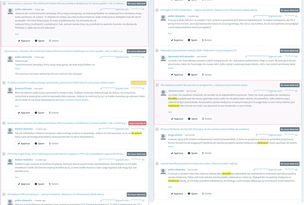Bezprawnik walczy z marketingiem szeptanym od swojego startu w kwietniu 2015 roku. Każdego dnia w naszym serwisie pojawia się około 200 nowych komentarzy, nierzadko przy archiwalnych tekstach. Stali czytelnicy wiedzą, że stosujemy mechanizm filtrowania wypowiedzi zawierających linki oraz określone słowa. Nie jest to jednak zauważalna liczba - zwykle czasowo blokuje się koło 10 komentarzy dziennie. Większość z nich to amerykański spam z kasynami i pożyczkami. Część zawiera wulgaryzmy. Kilka - faktycznie - jakieś sensowne wypowiedzi z linkami. A cała reszta to marketing szeptany. Nauczyliśmy się już, które firmy prawdopodobnie korzystają z takich praktyk, jakich zwrotów używają i np. żaden komentarz ze słowem "benefity" nie pojawi się w naszym serwisie bez ręcznej akceptacji. Jak na razie cierpią na tym tylko spamerzy.