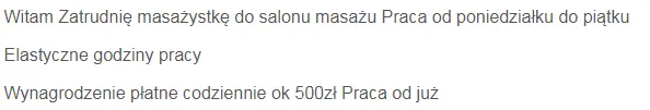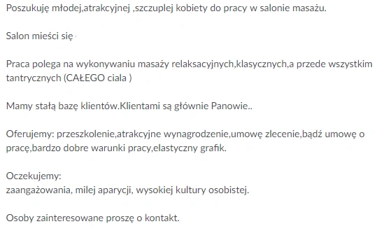 Zarobki? 4500 - 7500 złotych. Tutaj zresztą nie ma wielkiego ukrywania, na czym praca będzie polegać. Pracująca ma być młoda, ładna, szczupła, wykonywać masaż całego ciała, a reszta najwyraźniej przyjdzie już sama.