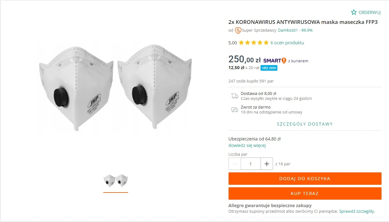 Jak widzimy, w nazwie oferty mamy zapis, że przedmiotem jest zakup "koronawirus antywirusowa maska maseczka FFP3". Jest to ewidentne nadużycie ze strony sprzedającego. Ta maseczka w żadnym stopnie nie chroni przed wirusem. Wiecie dlaczego? Bo można ją kupić w dowolnym markecie budowlanym i ma inne zastosowanie.