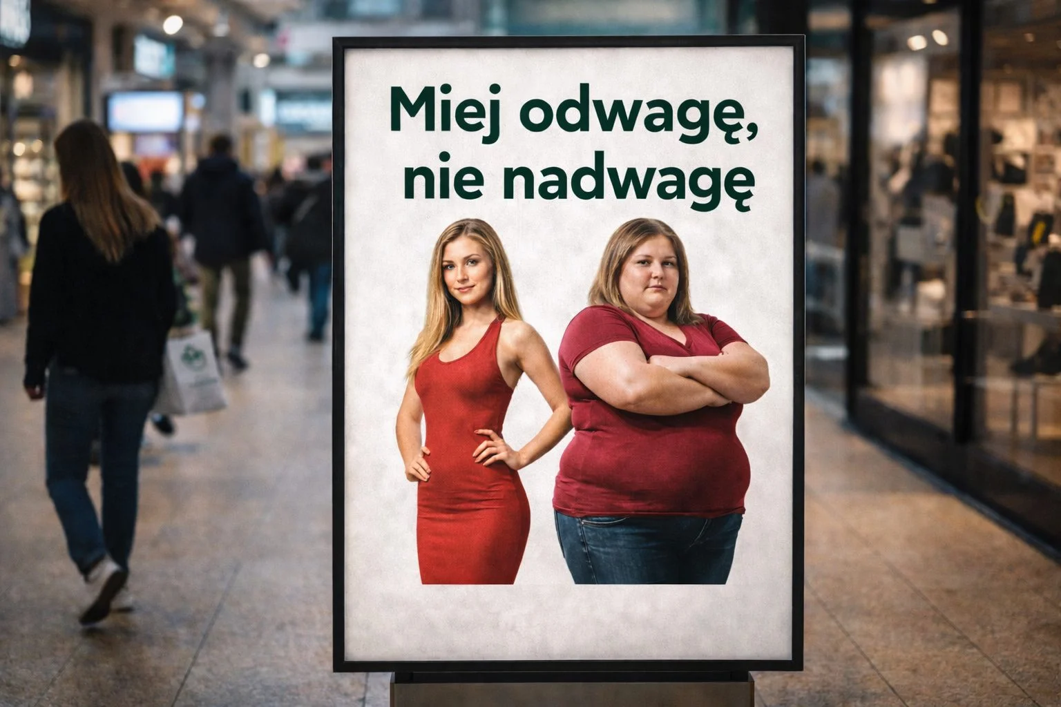 Reklama sieci dietetycznej Naturhouse, która jesienią 2025 roku wisiała w poznańskim centrum handlowym King Cross Marcelin, przekroczyła granicę między marketingiem a piętnowaniem. Zespół Orzekający Komisji Etyki Reklamy nie miał wątpliwości: zestawienie szczupłej i otylej kobiety opatrzone grą słów „Miej odwagę, nie nadwagę” to komunikat dyskryminujący, który łączy cechy charakteru z wyglądem zewnętrznym. A tego, zdaniem KER, robić po prostu nie wolno — tym bardziej firmie z branży zdrowia.