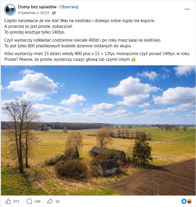 Wpis widoczny na poniższym zrzucie ekranu pojawił się kilka dni temu na facebookowym profilu agencji Domy bez sąsiadów. Specjalizuje się ona w pośrednictwie w sprzedaży i zakupie konkretnych typów nieruchomości, czyli siedlisk, naokoło których w sporej odległości nie ma żadnych innych budynków.