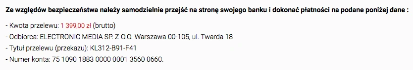Ciekawostką - budzącą spore wątpliwości co do zamiarów właścicieli sklepu - jest to, że sprzedawcą w świetle regulaminu sklepu jest „Przedsiębiorstwo Prod. Handl. Hurt. Wielobr. Detal Wojciech Ciszewski z siedzibą w Koszalinie”, współpracujący z Electronic Media sp. z o.o. Co więcej - choć sprzedawcą jest pan Wojciech Ciszewski i do to niego można kierować ewentualne roszczenia z tytułu zakupu sprzętu, to na konto bankowe Electronic Media sp. z o.o. należy wykonać przelew za zakupiony sprzęt.