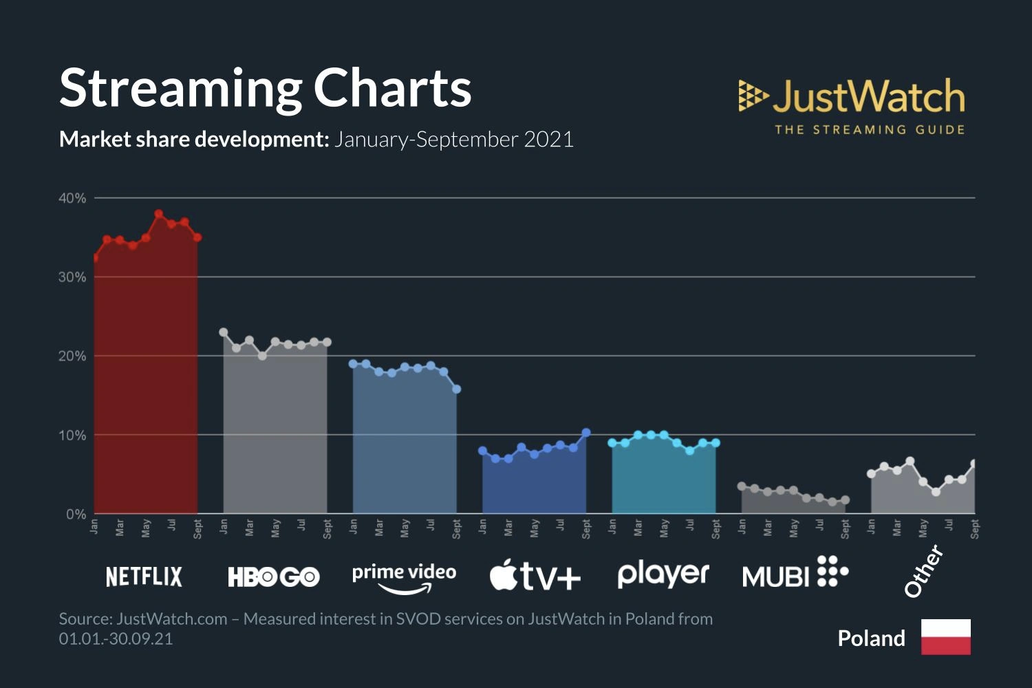 To niezły wynik, ale na drugim miejscu z rezultatem 22 proc. jest HBO GO, a podium - z wynikiem 18 proc. zamyka Prime Video. Zaskakująco wysoko znalazło się Apple TV+, które ma udział rynkowy szacowany na poziomie 9 proc., wyprzedzając w ostatnim miesiącu Playera. Usługa Apple wydaje się być mimo wszystko najbardziej ekskluzywna, a pomimo kilku świetnych seriali ma relatywnie ubogi katalog na tle konkurencji. Gdy zainteresowanie Netfliksem i Prime Video malało, tylko Apple TV+ zauważalnie rosło w ubiegłych miesiącach.