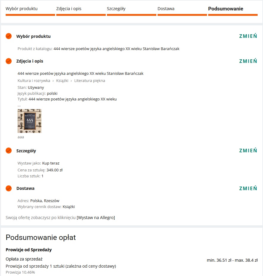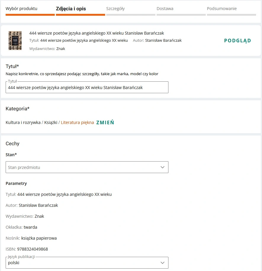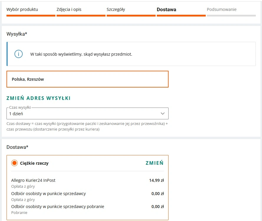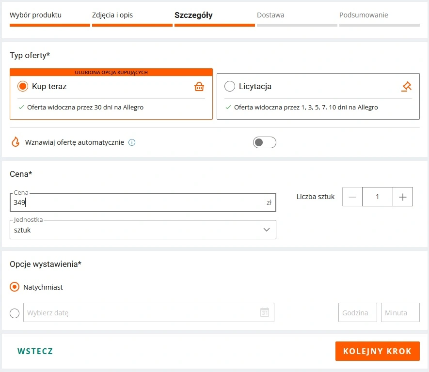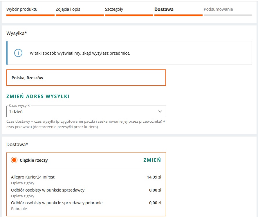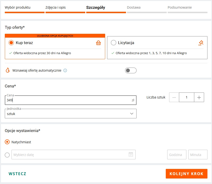 Następnie wypełniamy pola ze szczegółami oferty i dostawą.
